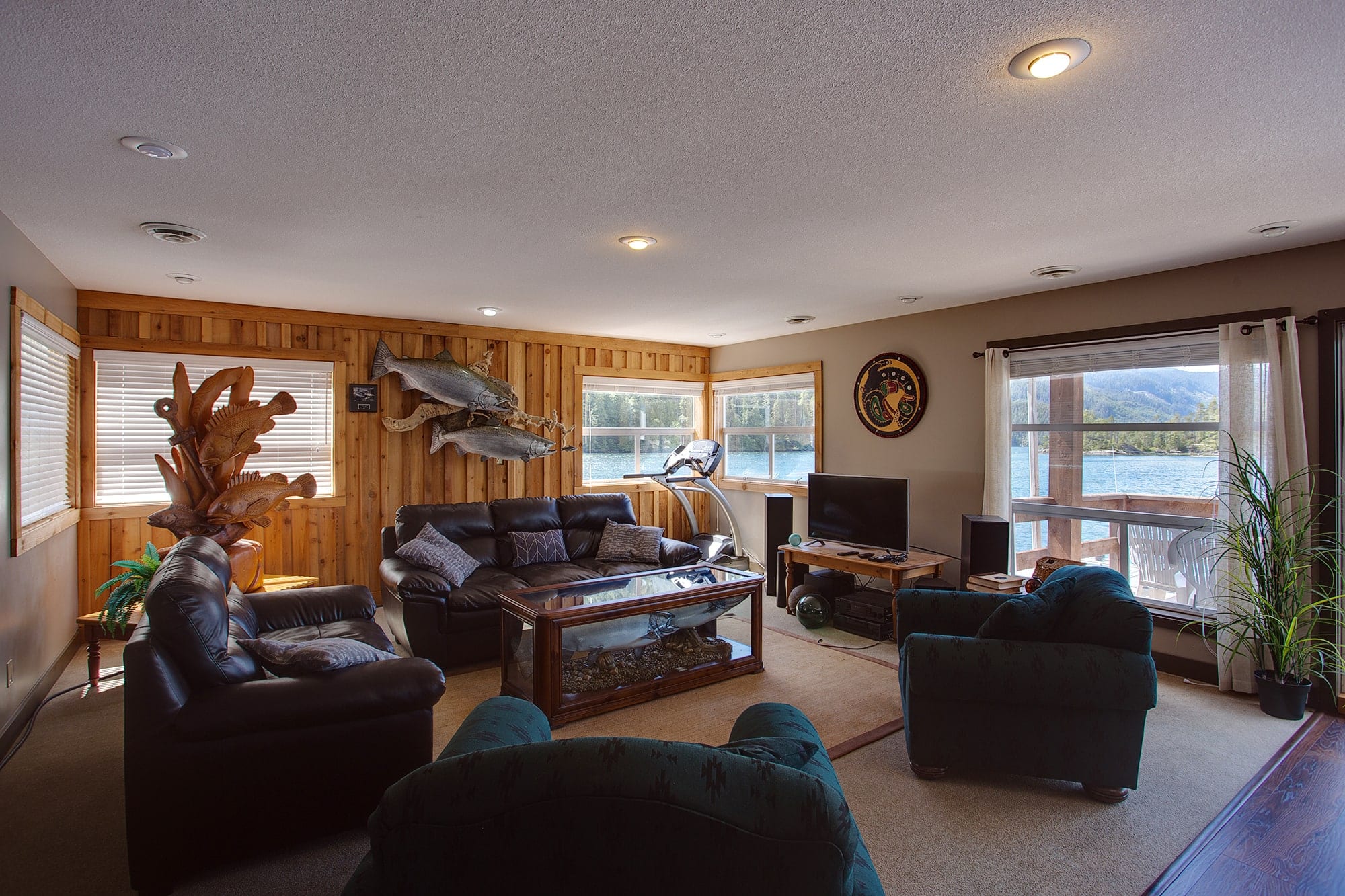 The main lodge features a beautiful dining room with large live edge fir tables created right in our backyard and a sprawling lounge with comfortable couches and games for you to enjoy. After a full day of surfing, fishing and adventure, our large front deck is the perfect spot for you to relax, unwind and enjoy the sunset with friends.